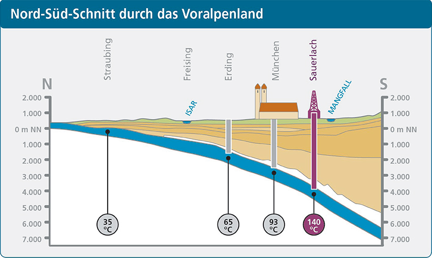 Unterhalb von München wird die wasserführende Schicht gemäß obiger Schnittansicht von Norden nach Süden durch den Fuß der Alpen in tiefere Regionen abgelenkt. Daraus ergeben sich Wassertemperaturen von bis zu 150 °C im Süden Münchens. Das heiße Wasser kann mit einem Volumenstrom von bis zu 120 l s-1 (Liter pro Sekunde) gefördert werden, muss allerdings aus Tiefen von über 4000 m herausgehoben werden.