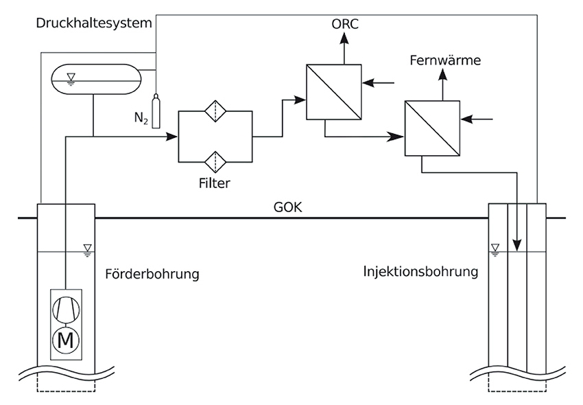 Während des Betriebs der Anlage wird das heiße Tiefenwasser durch die Förderbohrung mit einer auf 1200 m abgesenkten Pumpe (mit Antrieb M) in das obertägige Kraftwerk gepumpt und durchläuft Filtrationssysteme (Rückspül-Trommelfilter, Kerzenfilter, Beutelfilter), um später die thermische Energie in einem Wärmetauscher-Netzwerk an das Arbeitsmedium des stromerzeugenden Sekundärkreislaufs und das Fernwärmenetz abzugeben. Nach einer Temperaturspreizung von ca. 90 °C bis 100 °C wird das abgekühlte Tiefenwasser in das in der Tiefe liegende Reservoir über eine Injektionsbohrung re-injiziert (rechts oben im Bild).
