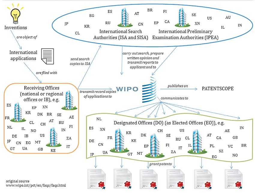 Durch den Patentzusammenarbeitsvertrag (Patent Cooperation Treaty – PCT) kann mit nur einer Anmeldung für eine Vielzahl von Ländern weltweit ein Anmeldetag begründet werden. Eingereicht wird bei einem der 116 Receiving Offices (RO), welches die Patentanmeldung an die WIPO (World Intellectual Property Organization) in Genf sowie die zuständige International Search Authority (ISA) weiterleitet.